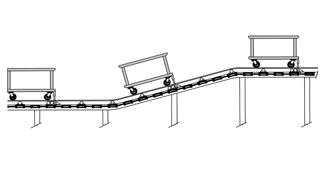 Towlines pull carts using tow pins, pusher dogs, or custom fixtures. As the chain travels through a defined channel, it guides each load through every required station at a steady pace. Because everything stays at floor level, loading and unloading remain ergonomic and efficient—no lifting equipment needed.